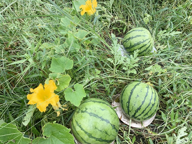 今年6本植えつけのスイカ達 7月末からの収穫 今まだ畑の中 スイカゴロゴロ